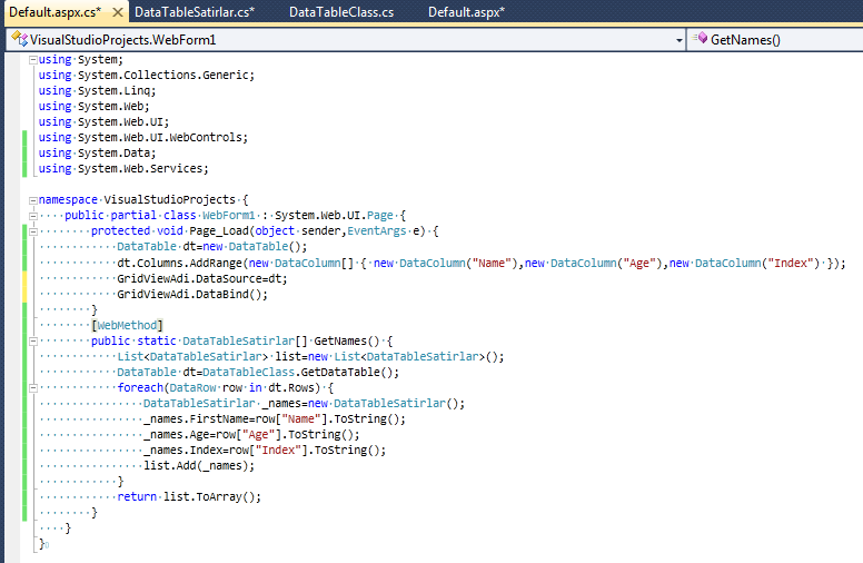 - Simdi de sayfamızın code behind ında bir web metod tanımlayalım.Bu web metod da bize datatble dakı verileri kendı olusturdugumuz bir liste atasın.