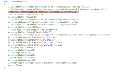 Kod calıstırıldıgında Urunler.xml adında bir dosya olusur ve içerigine verdigimiz